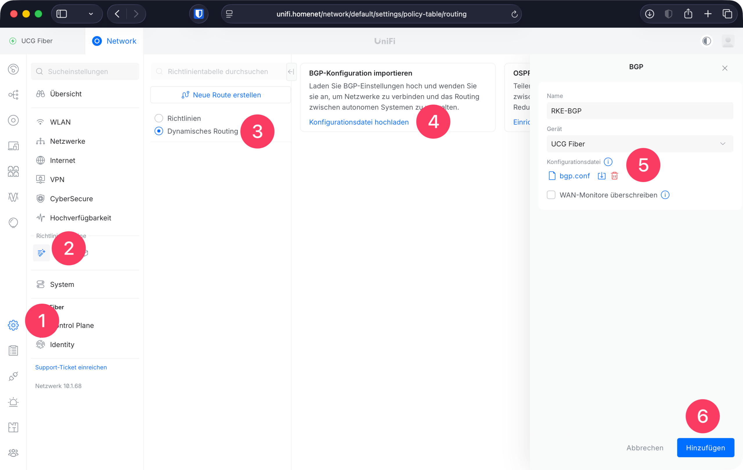 - BGP-Konfiguration am Router (hier am Beispiel eines Unifi Cloud Gateway Fiber)